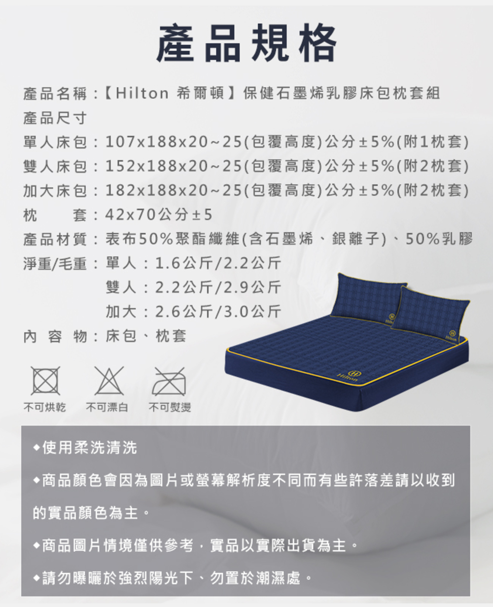 產品名稱:【Hilton 希爾頓】保健石墨烯乳膠單人床包枕套二件組(B0099-S)