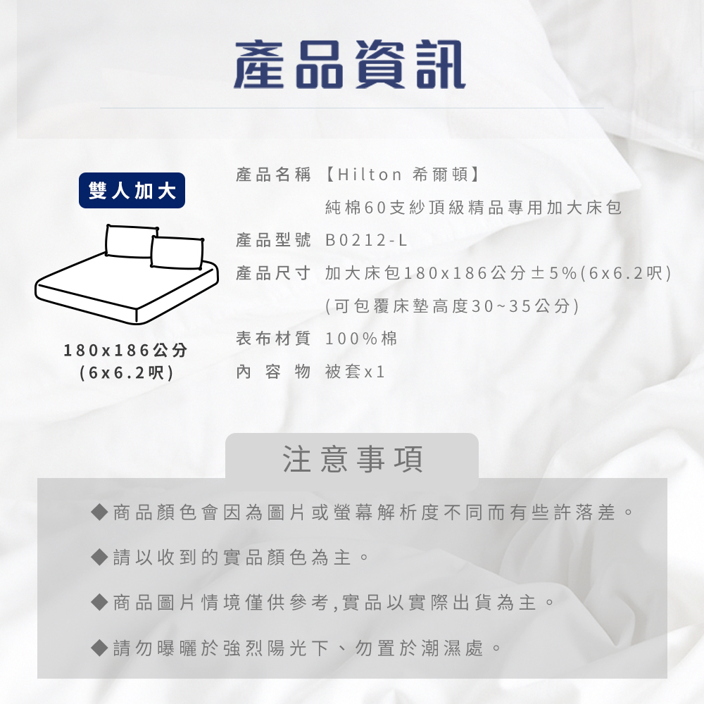 產品尺寸:加大床包180x186公分±5%(6x6.2呎)(可包覆床墊高度30~35公分)、枕套49x77公分±5%