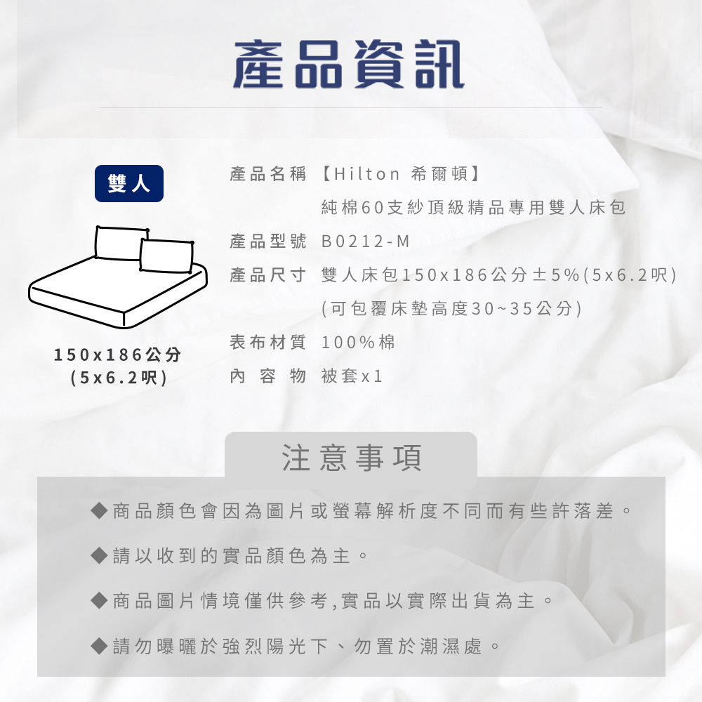 產品品名:【Hilton 希爾頓】五星級精梳純棉60支紗頂級精品專用雙人床包枕套三件組